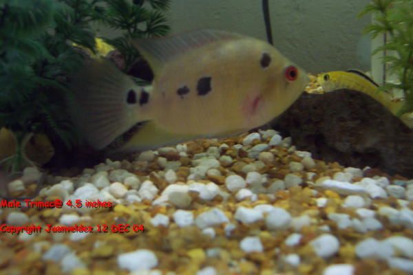 actually the midas and trimac are not in the same tank. the trimac is in a divided tank because on the other side is a pair of jags that are about 5.5-6 inches and the midas is divided because on the other side of the tank is an award winning Crenicichla Frenata. the Frenata won its class at the ACA show in 2003. and I don't want them to be getting into too much of a peeing match.