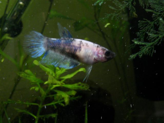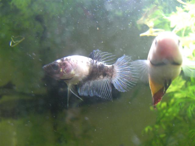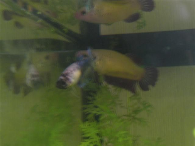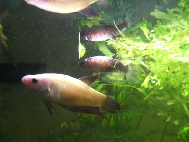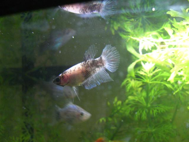 well my two new girls that i got last week were confined to a split breeding trap for a week so that my big girl would get used to them. i let them out today and a bit of flaring and a bit of quarreling between the two new girls. the big girl asserted herslef but no physical contact was made. thin is, as soon as i saw the mable "vt girl" flare i imediately though "ohhh" what do you recon? he/she is very small still, only about 2cm long. a visable egg spot but that is not neccessarily a sure fire thing. just the way it was flaring and the shape. the ventrals are long and has a big flare "face", although the skinn under the gill covers is almost transparent so dificult to see