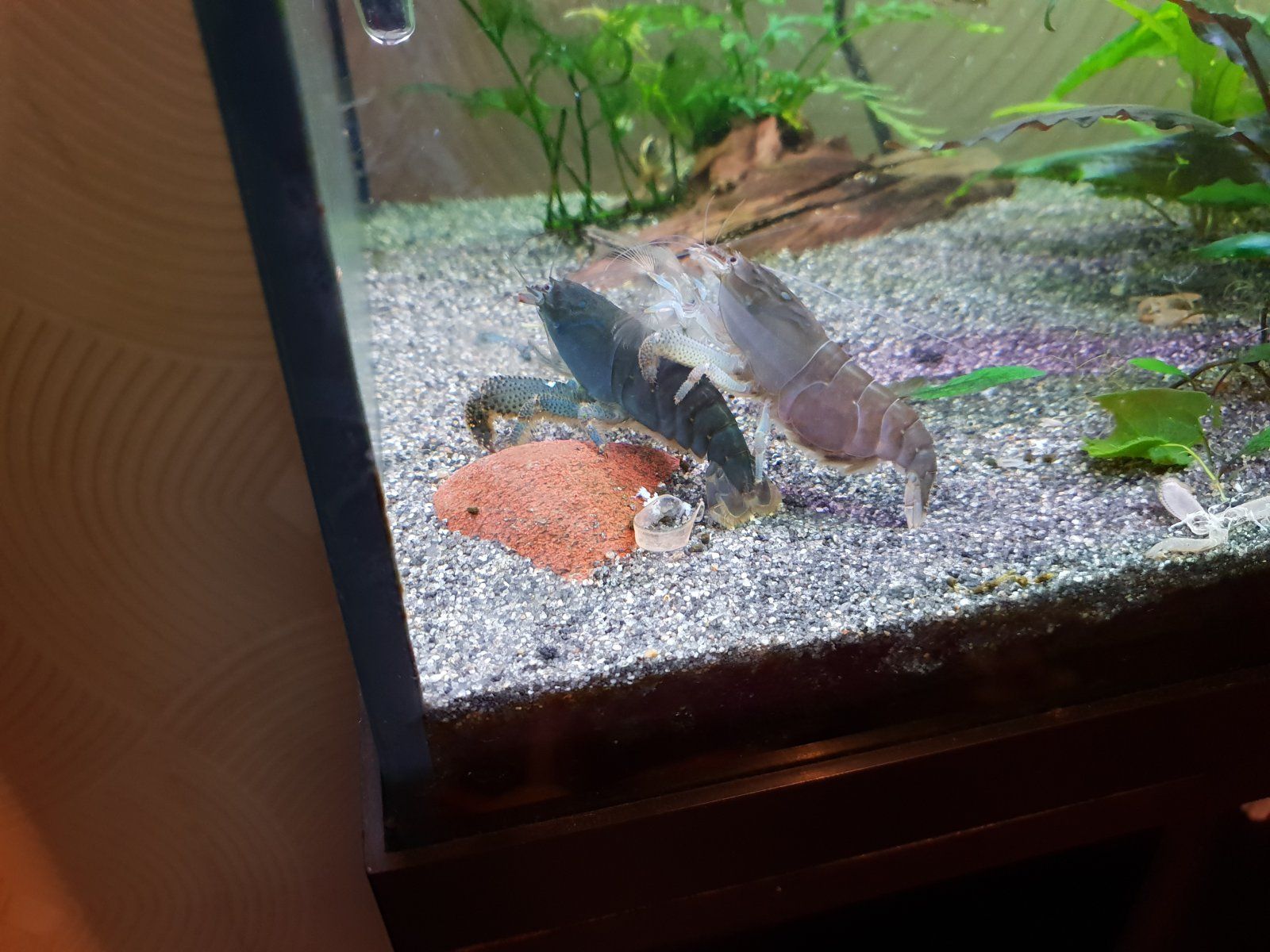 Originally had one shrimp (named Kabal) who shed last Saturday, and now I have another (Kano). Kano (shrimp #2) is much more blue (and smaller, of course) than Kabal (#1), but I've not observed their physical differences well enough to determine whether or not I have a male and a female pair yet.
