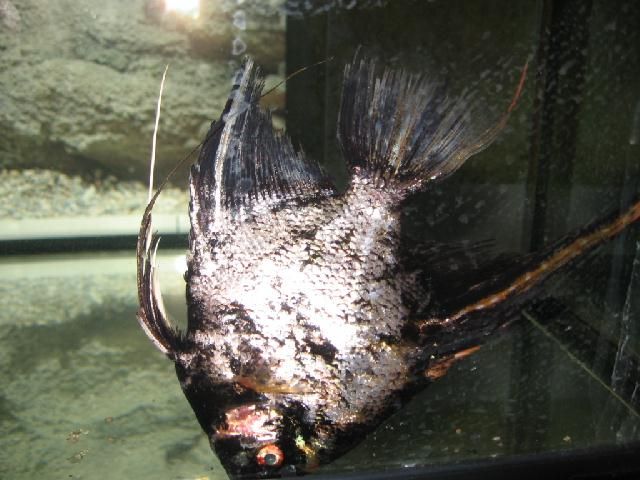 He's usually a black colour with a few silver and orange blobs. The picture is quite accurate of his colour now. Mostly silver with a strange pinkness to it. Would I be right in thinking skin/gill flukes? Last night he ate one mosel but today he has really gone downhill. I did wonder if he'd been rounded on by my other two angels....who have been getting a fair bit bigger of late.....and he's just been badly beaten and is super-stressed....