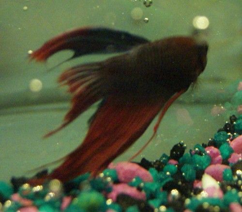 Now, he's set up in his very own 1 gallon tank with clean, crystal clear water, a touch of salt and some stress coat. I'm not sure if I'm going to medicate him or not. He's perked up a ton since we got him and has been alertly exploring his new environment. I think he's a very happy camper, now. I don't have any really good pics of him, but I've got one that shows the poor state of his tail fairly well. I'm glad we picked him up. Any advice, anyone? Bettamomma? *grin*