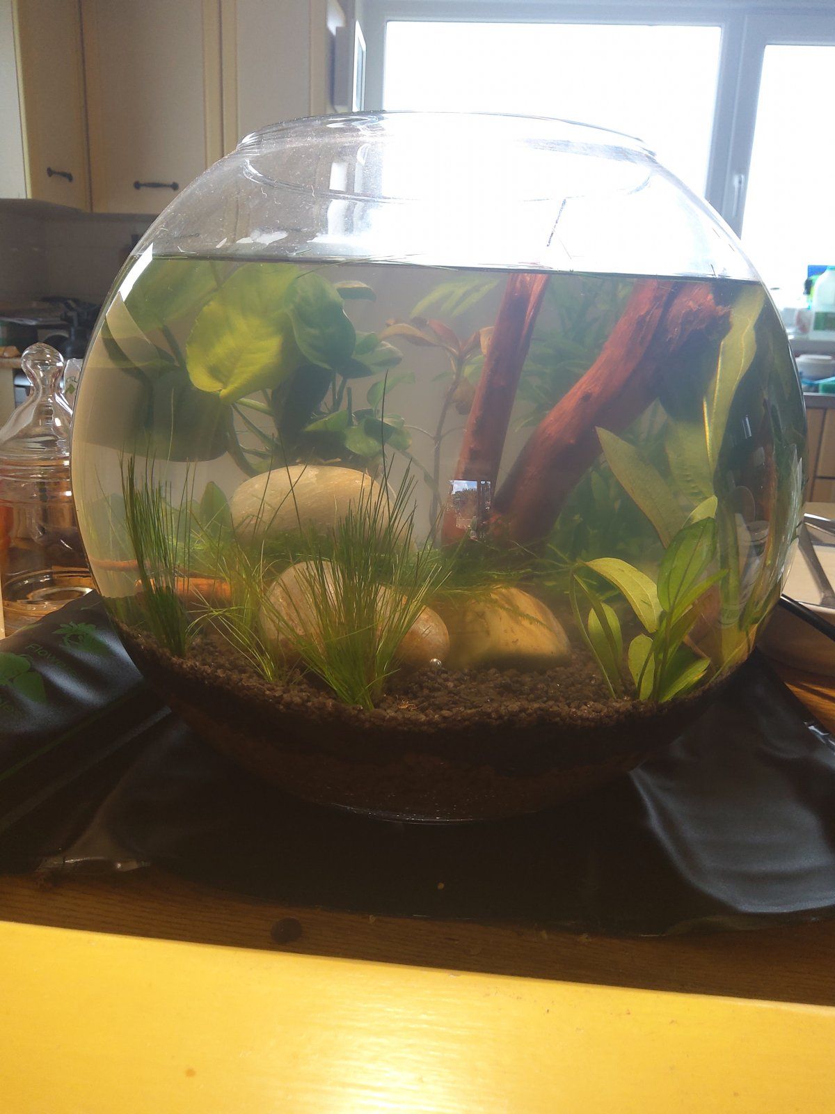 Yessss Sunnyspots that looks awesome! You could definitely put shrimp in that. I've got no lid on mine, the water level is even higher than yours and I've had no shrimp jump out! Go for it!You inspired me to take the plunge and make one too. It has no lid so no shrimps for me, but the lidded jar I found cost a fortune in postage. I hope mine will fill out like yours! Excuse the murkView attachment 139544