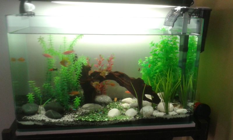 Hey everyone! I have been running a tropical freashwater aquraium for about 7 months and I was wondering what other peoples look like. My aqurium is planted with three plants, and a peice of aquatic wood. I can't for the life of me remember the names of the plants though! My tank looks rather empty so I think I may add some more plants so the fish feel more natural. Could everyone post pictures of there aquarium that would be great! Thanks in advance!