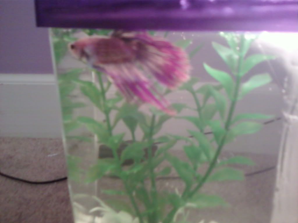 This is my friend's birthday present. I visited the petstore once with her to get something for her dog, and luckily, I stopped her before she could purchase a crappy little plastic 1/4 of a gallon little cup for bettas. This is what it said on the back "Bettas prefer small and shallow homes, so this is perfect for bettas!" Its in this little hexagon shape and its VERY tiny. lol. Anyway, I held her back from buying a betta and that stupid little rip off tank. (Actually it didn't even come with anything, just a plastic container lol) So instead, I bought her the 2.5 gallon minibow tank, white gravel, a plastic plant, and a betta. Here is the betta I purchased. He's purple with pinky-purple fins, though they kinda look red here. sorry for the quality, it was taken with my phone.