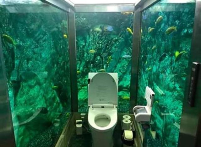 The aquariums are built into the bathroom walls.Where is the fish tank