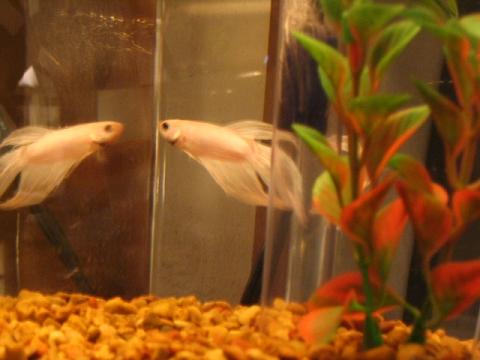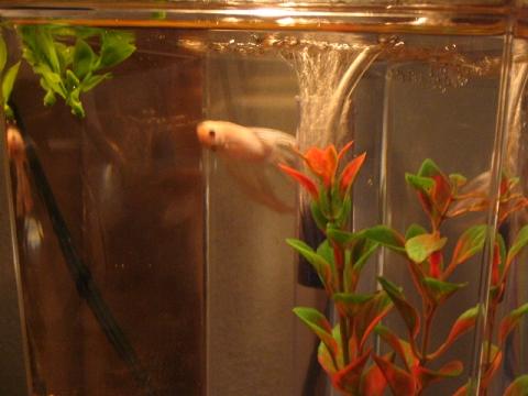 Well, I went over to Wallmart to check out the new stock of Bettas, and pick up a shirt for my int. tomorrow at PetCo. Well, there were no green Bettas, but there were two of them that looked really sad in their cups, and I just had to get them both...but only had enough for one. Well, I keep thinking about the other one i left behind...so if I come home with him tomorrow..*sigh. All of you know how it is. Well, here is my new little guy ( I also bought a heaters..plants...medications..blah blah blah. Found a 45 gal with a free sign on it in front of someone's house..It holds water!!! guess they just didn't want it. Prolly had a Betta addiction and needed to quit...lol )...Any Name Ideas? I was thinking Neptune. (lol: Bettamomma: this one kind of looks like a Casper. )