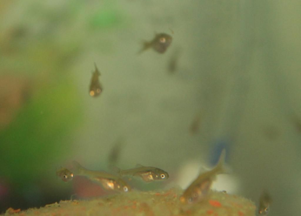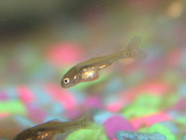 I adopted a 10 gallon aquarium a week ago. I saw an ad on cl for a tank with baby fish, the mother fish died after giving live birth and the fish described sounded to me like a guppy, I had had guppies from 1967 when I was in kindergarten to 1979 when I moved away from home. I counted the fry as I returned them to their clean tank and there were 176 live fry and a few dead ones ones. They are now between 3/16th of an inch to 3/8th of an inch long and in all ways resemble both guppy and gambusia fry, but they all have forked tails, not rounded. I can only assume for now that they are guppy fry or gambusia fry and in a month I should start seeing signs of if they are guppies.