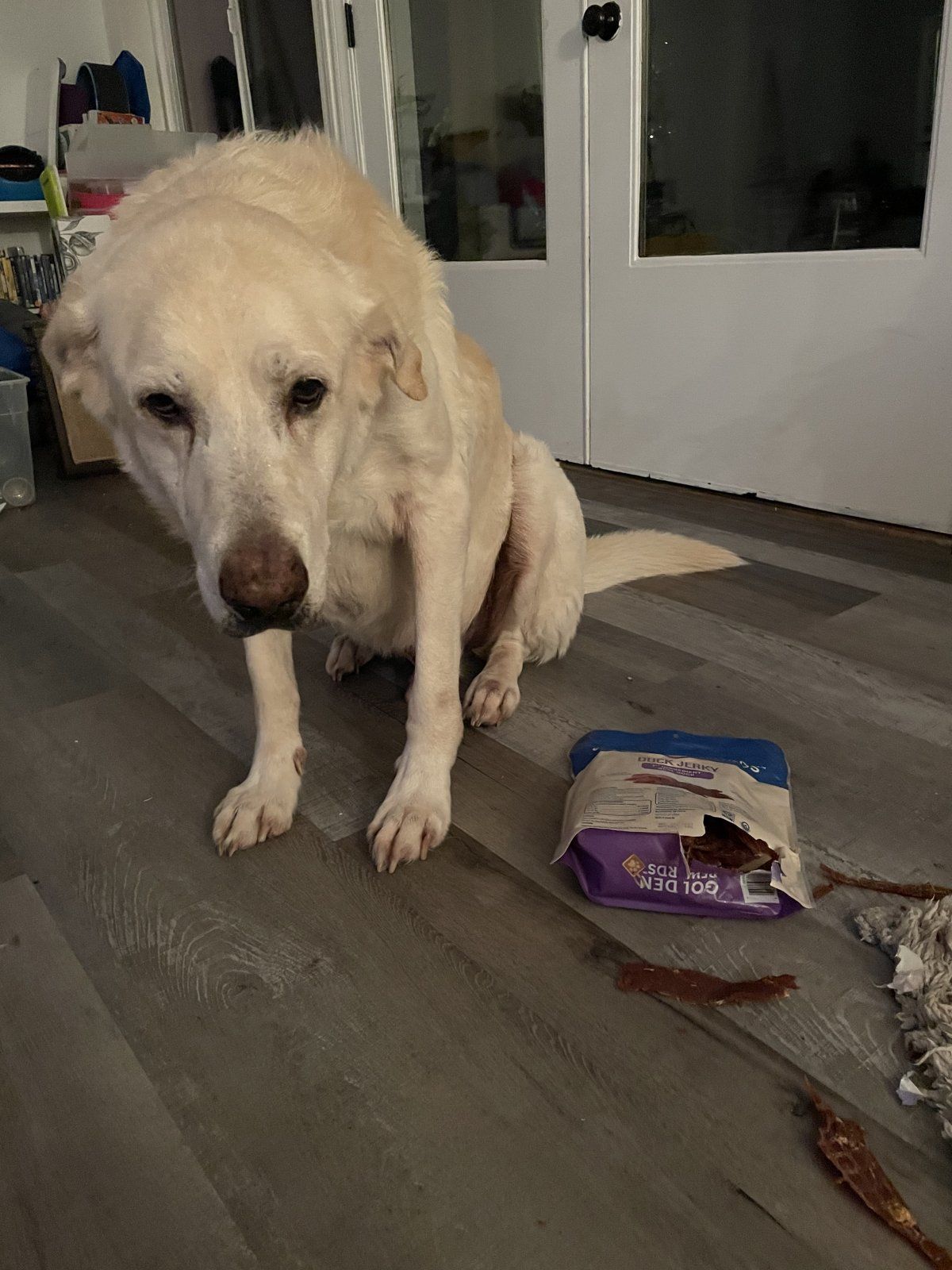 He was so happy to see me, until I saw the bag of treats all torn up. I silently looked at him, looked at the bag, and back again. He immediately looked so guilty.
