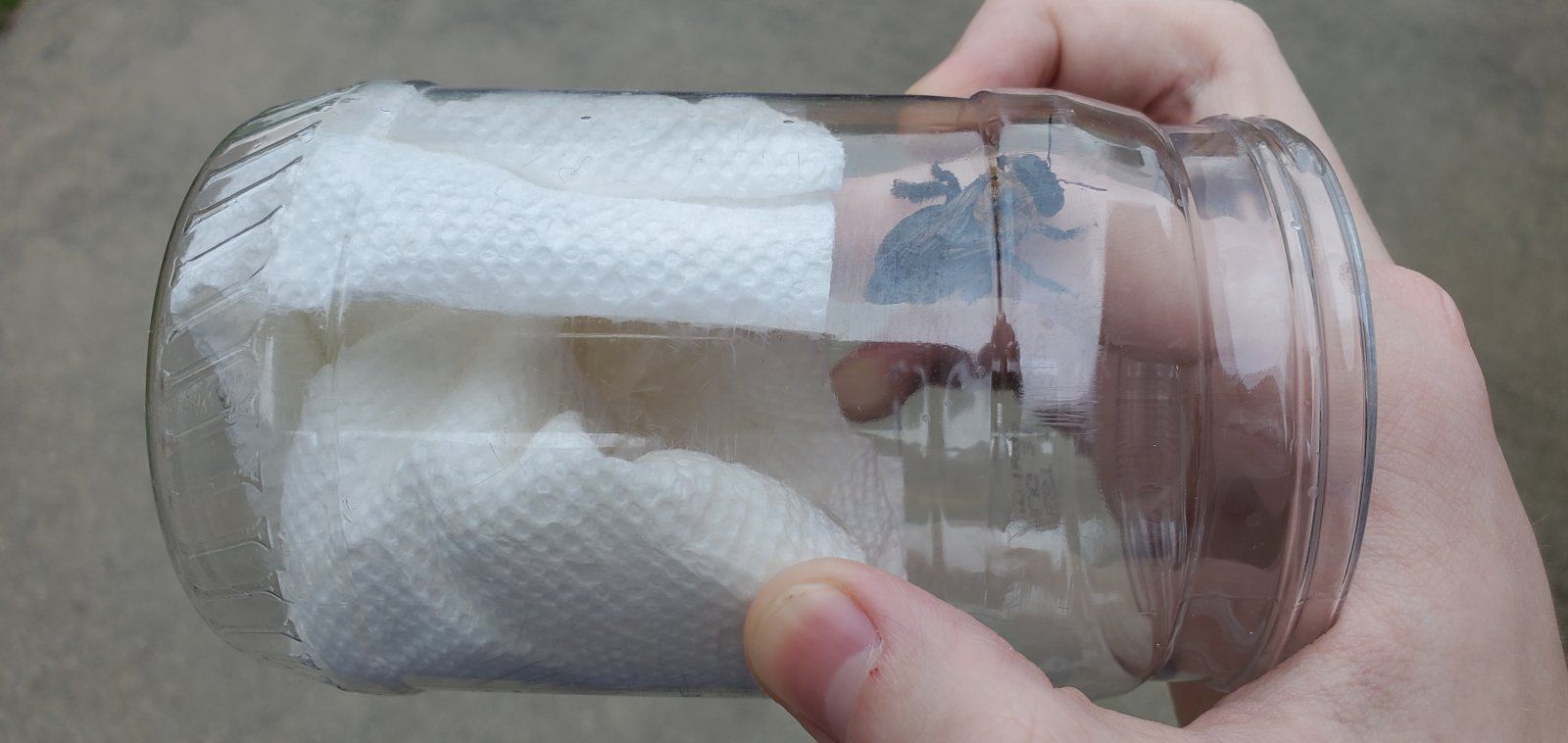 I now have him in a jar with paper towels at the bottom so he can get dry and thwn fly out when he wants to.