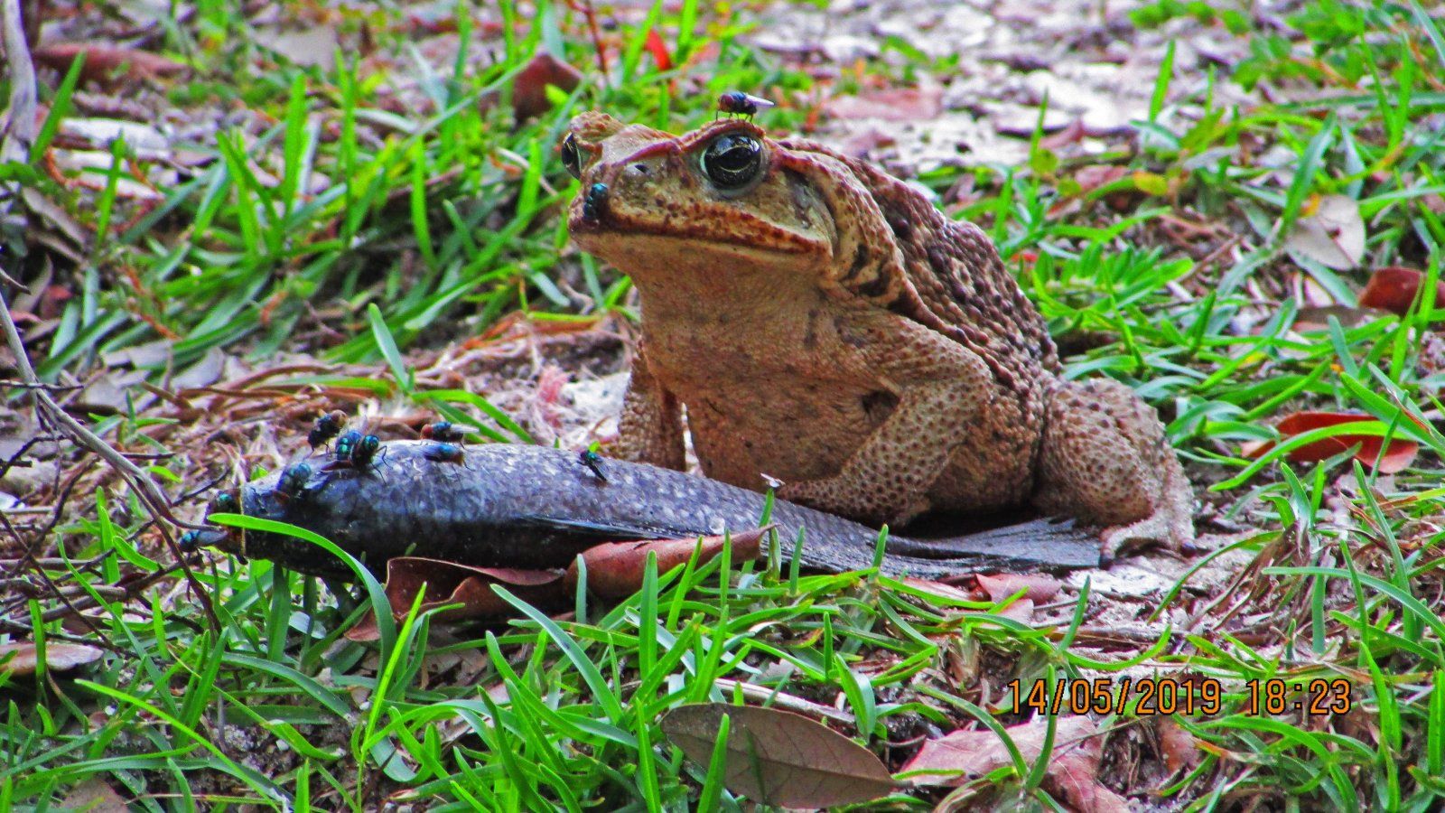 When I was living in Florida in 2019, I also saw a cane toad. He was eating the flies around the dead fish, in a park next to the limit between West Palm Beach and Lake Worth Beach.Good griefI can handle a frog but that thing is enough to get a squeal out of me