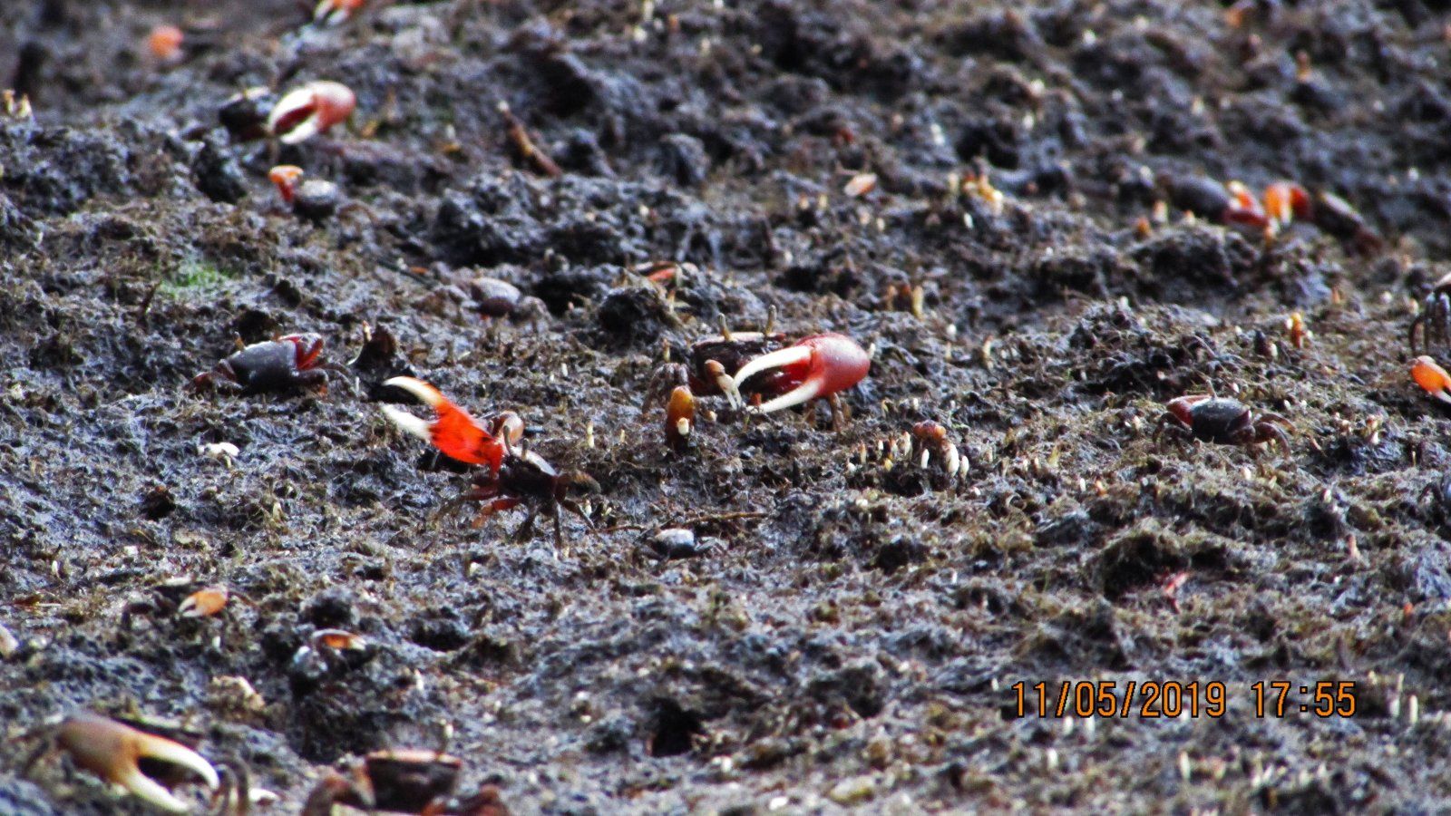 Since almost every day I rode with my old bicycle, in low-tide hours, it was possible to take photos from the crabs (I suspect being Minuca or Uca), like these from this photo: