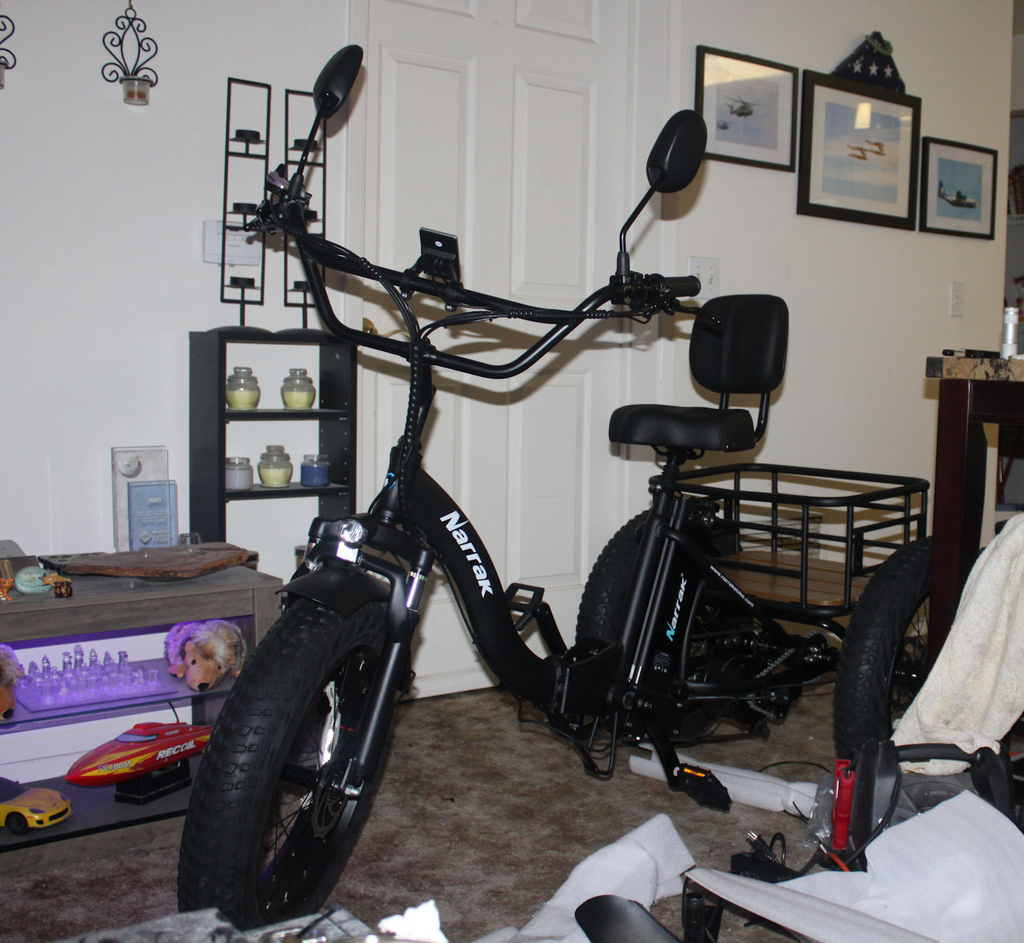 This beast is REALLY cool! Pardon all the packaging stuff around but here it is in my apartment. Looks like it takes my whole apartment but it is fully unfolded. Folded the length is a lot less. Still need to mount the back fenders but here it is...