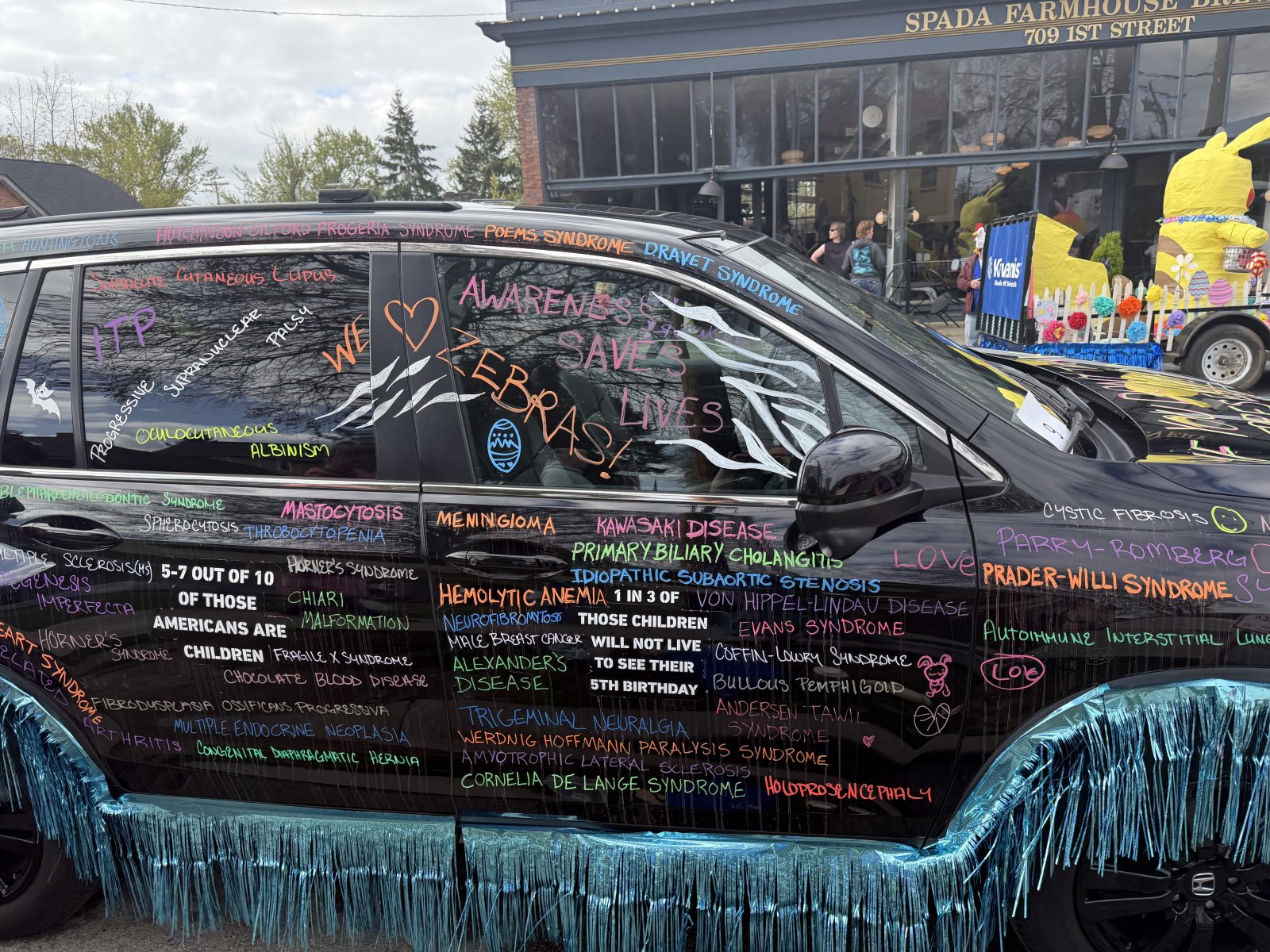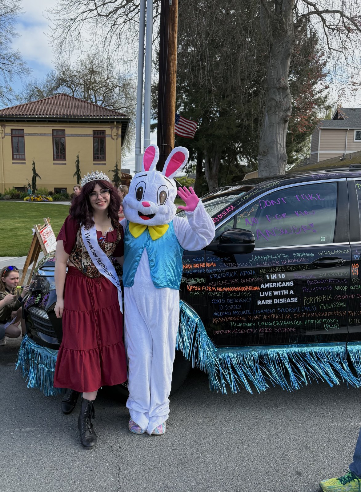 For a second there I thought the girl in the first pic was flipping off the camera.Today I participated in our local Easter parade! The only one in Washington state. My float was covered in the names of rare diseases. We won 3rd place in the float judging. I also made it on Fox NewsView attachment 365757View attachment 365758View attachment 365759View attachment 365760View attachment 365761View attachment 365762View attachment 365763View attachment 365764