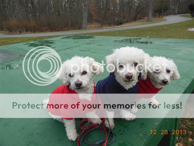 Willy - purchased at age 8 weeks by an older couple who wanted a small lap dog, and they got Willy, who grew larger than standard, and is a very bossy dog. He ended up biting them many times in the 8 years he lived with them, he became a bully. They surrendered him to a local shelter when they could no longer cope, and were too embarassed to take him to their vet again. Bichons are known for their allergies, and Willy has plenty. Neither the couple nor their vet knew what to do for a bichon, so Willy suffered for many years (I got all his vet papers when I picked him up at the shelter, for the bichon rescue - stacks!). When they surrendered him, his eyes were sealed shut with infection, and his skin was full of a yeast infection, bright red and you could feel the heat from an inch away. Poor dog was miserable and of course snapping at any touch. Took 6 weeks to get him healthy. Changing his bully side took longer; I took him to 3 obedience classes (Basic Manners, Beyond the Basics, Above and Beyond) and then got him involved in Agility. Willy LOVED Agility!!! He rapidly progressed to competition level, and has won 3 blue ribbons!! Now age 10, he had hip dysplasia and extensive arthritis in both knees and both hips, the arthritis all due to his poor diet and life style his first 8 years. So we don't do any Agility now. Next I took him to Nose Work classes and he was excellent at that! Finances changed so currently not doing any classes. He was just diagnosed with Lyme disease 3 days back, so got him on meds for that at the moment. Willy has chronic dry eye so he gets prescription eye drops morning and night, plus Genteal artificial tears every 2 hours all day long. This is from the 8 years of not paying attention to his allergies. His first owners did not have him neutered until he was age 5 years, so he is a marker and hence wears a belly band in house at all time. Willy is a charmer, and no longer a biter. He is in the middle in the pic.