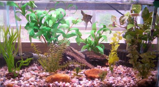 It looks pretty good nmarc! But I prefer smaller gravel, and real plants which give it a more natural look. Angels are great, aren't they?? Soon that one is gonna need a bigger tanks though, 'cuz they should really be in a talk tank, at least 18" tall.