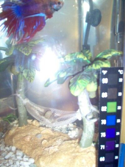 The funny thing is, whenever I put a plant in their tanks both betta's stay clear of them. Bluey even waited until I was watching, then purposely brushed against the plants and then swam away FAST, like they were hurting him. Puff Daddy saw this and did the same thing, now neither of them will go near any plant material, live or plastic. They do seem to enjoy sitting on top of the palm trees, though. And Puff Daddy and the frogs take turns in the hammock, I've included a pic from the old tank.