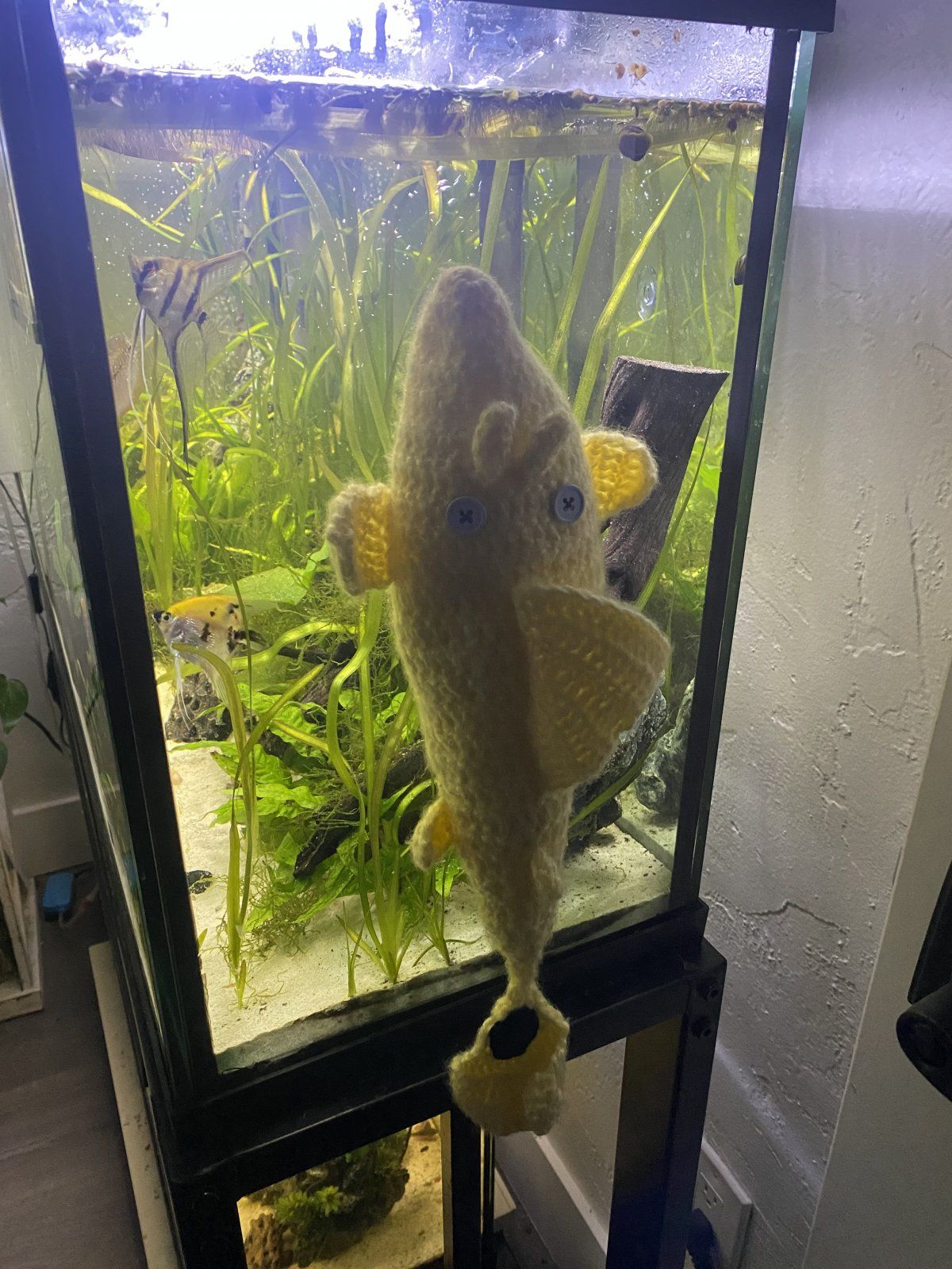So I didn’t get any angel babies but my sister crocheted me a plush of my female almost albino bristlenose who died for reasons I’m not entirely sure of(think it was a 50% water change with my cities hard water rather than 25% which is what I usually do)