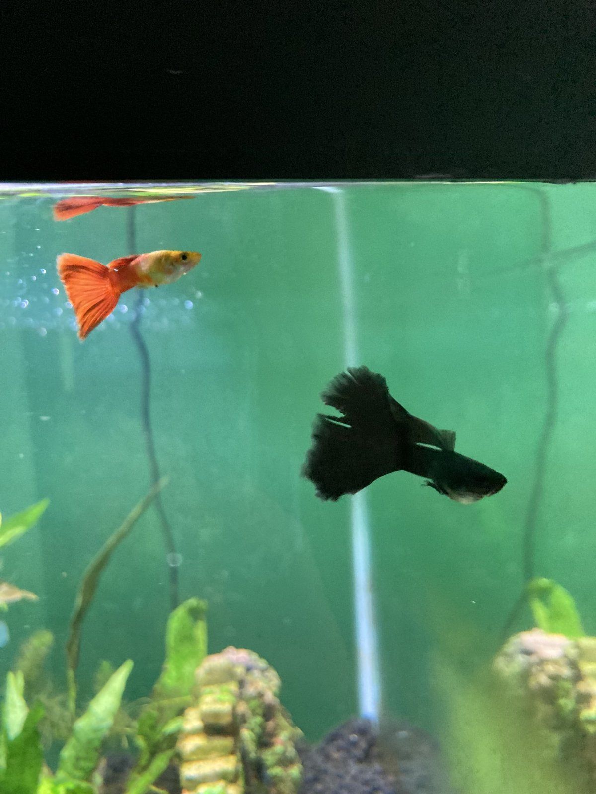 It was hard to get a clear photo. My smallest blue guppy also has tears in his tail, more so than the black one. I’m assuming one of the other guppies nipped their fins and tore them, but why did they do it and how do I get them to stop? I added Melafix at half strength to prevent fin rot, only half strength because I have a Gourami in there.