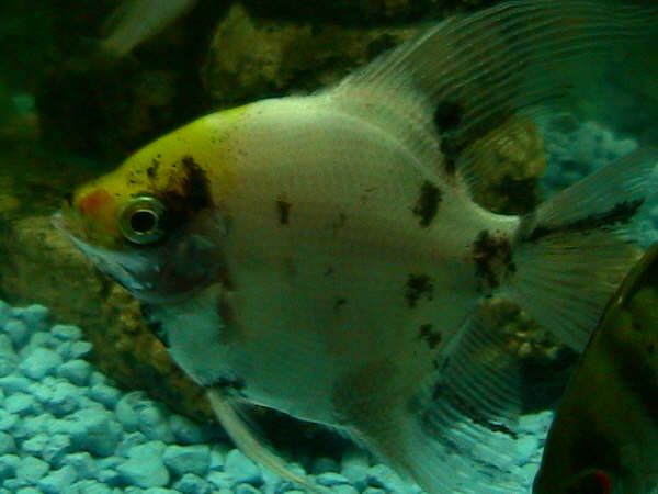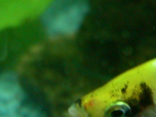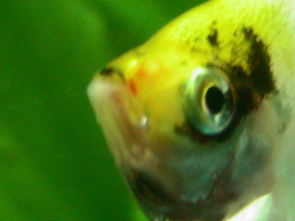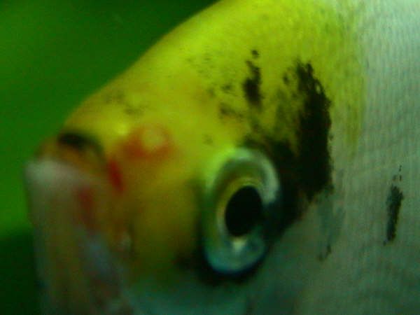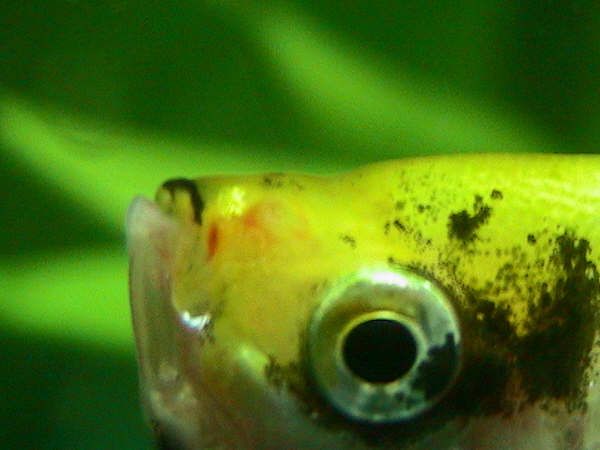 An infected fish will have off-white to gray cotton-like patches on the head, fins, gills, body and particularly the mouth. In time, these areas will develop into open sores. Gill swelling may occur, gill filaments may stick together and excessive mucus may develop in the gill area. Rapid breathing can be seen. Fins may deteriorate to the point of leaving the fin rays bare. Muscles may be inflamed and capillaries may rupture. Fish, particularly livebearers, may exhibit "shimmying". Infection may be acute (killing an infected fish within hours), or chronic (lingering for several days before eventually killing the fish). As with most diseases, not all symptoms need be present.