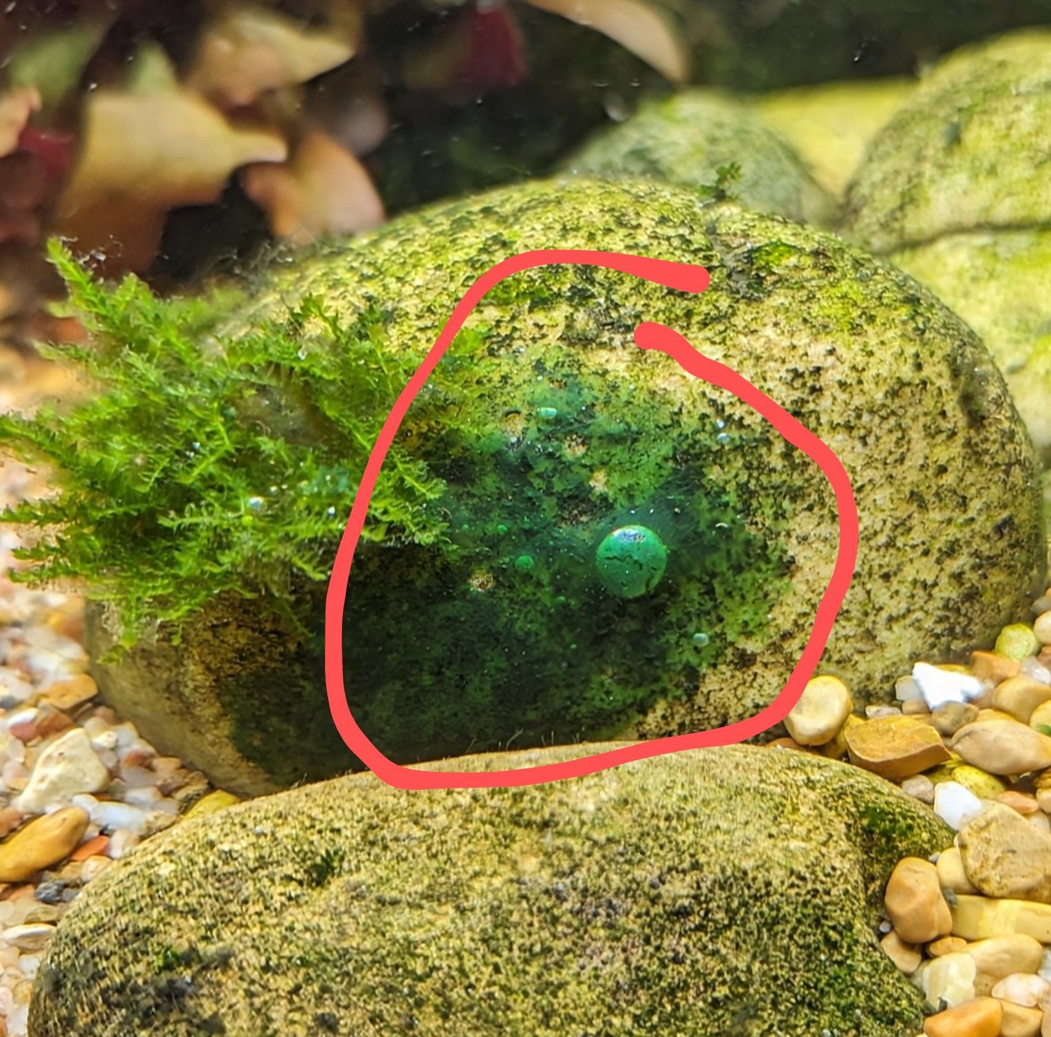 Looks like an M&M to meIs this just regular algae? It's hard to tell from the pic, but it's a brighter green than other algae I have and it's only in that one spot.