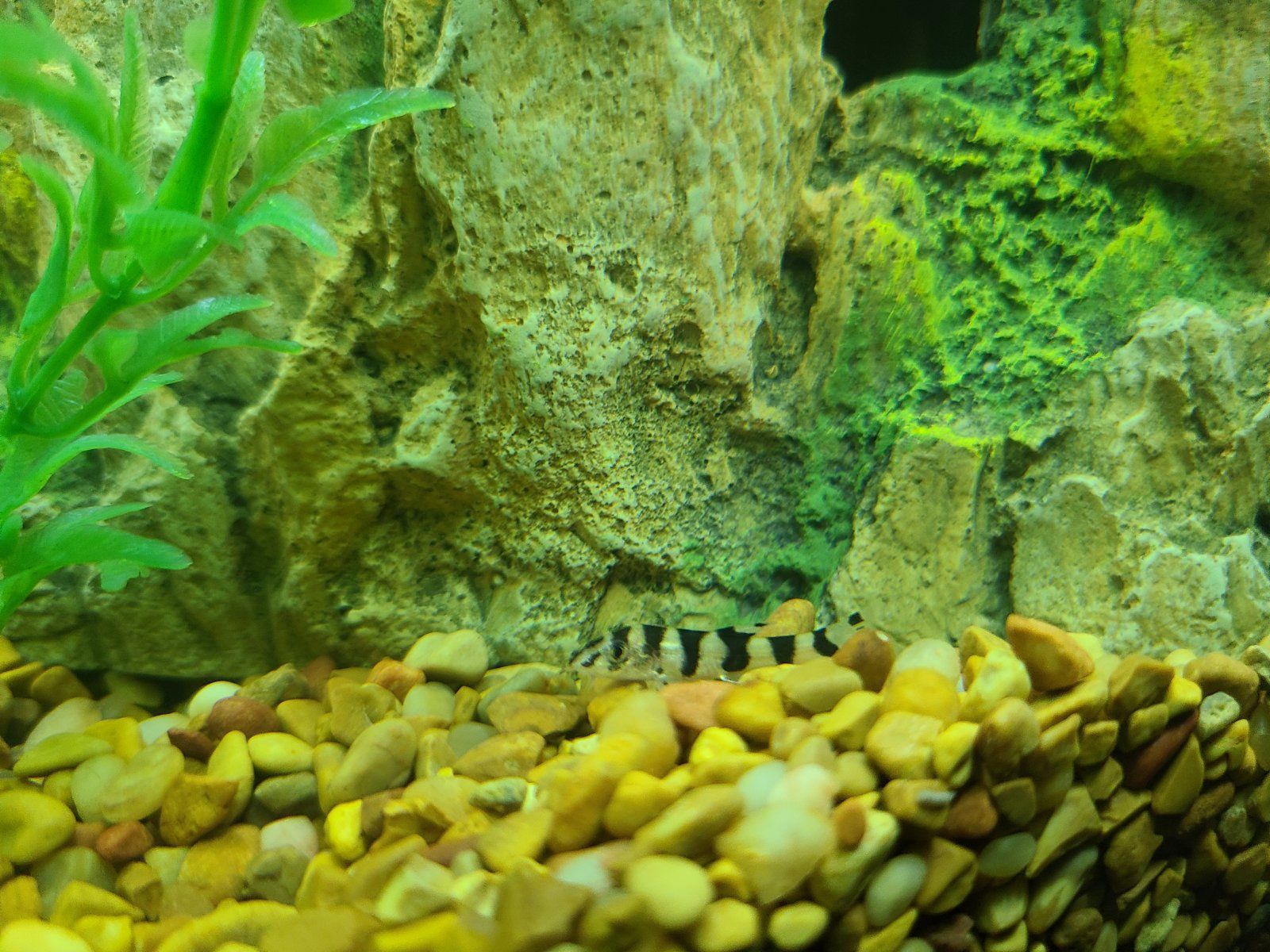 This species is very active, and as noted under Compatibility/Temperament needs a spacious aquarium with plenty of hiding spots so it can be kept in a group of at least 5 or 6, otherwise some members may be relentlessly picked on and succumb to stress and injury. A riverine aquascape would be ideal; a substrate of fine smooth gravel with smooth rocks representing boulders, caves made from bogwood or rock, and subdued lighting partially achieved with floating plants. Plants such as crypts,