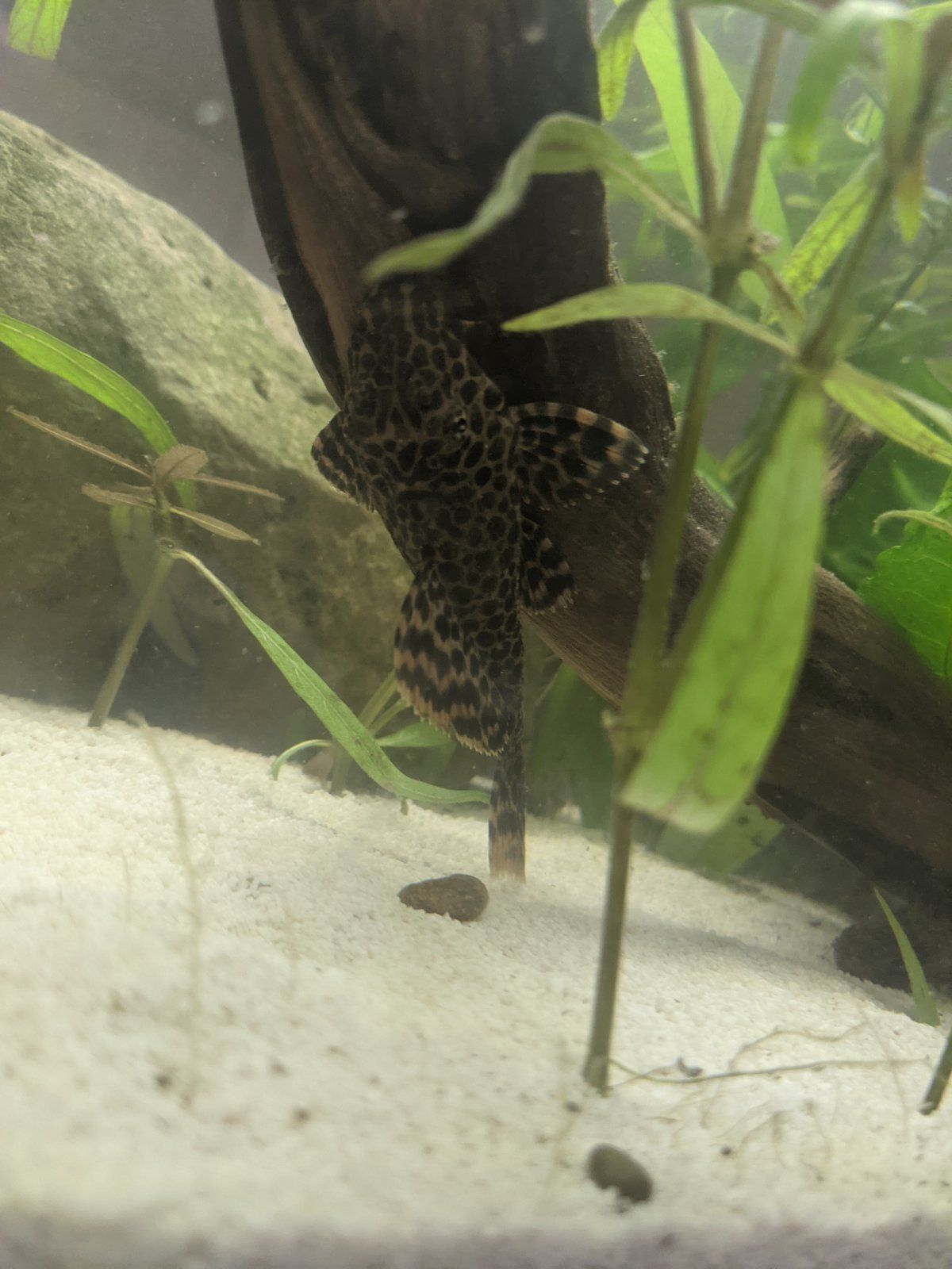 I've had a pleco since August and I have no idea what type he is. I got him from PetSmart but there was no species listed, all it says is Pleco (Large). It said his minimum tank size is 20 gallons but a lot of the PetSmart listings seem to be incorrect. I need to know because I'm not sure if he'll get too big for my smaller tank, 29 gallon. I can move him to my larger tank, 45 gallon. I took a few pictures but they're kinda crap because he won't leave his structure so I had to pick it up, which stirred up some debris. I've tried to get better pictures but I can't lol.
