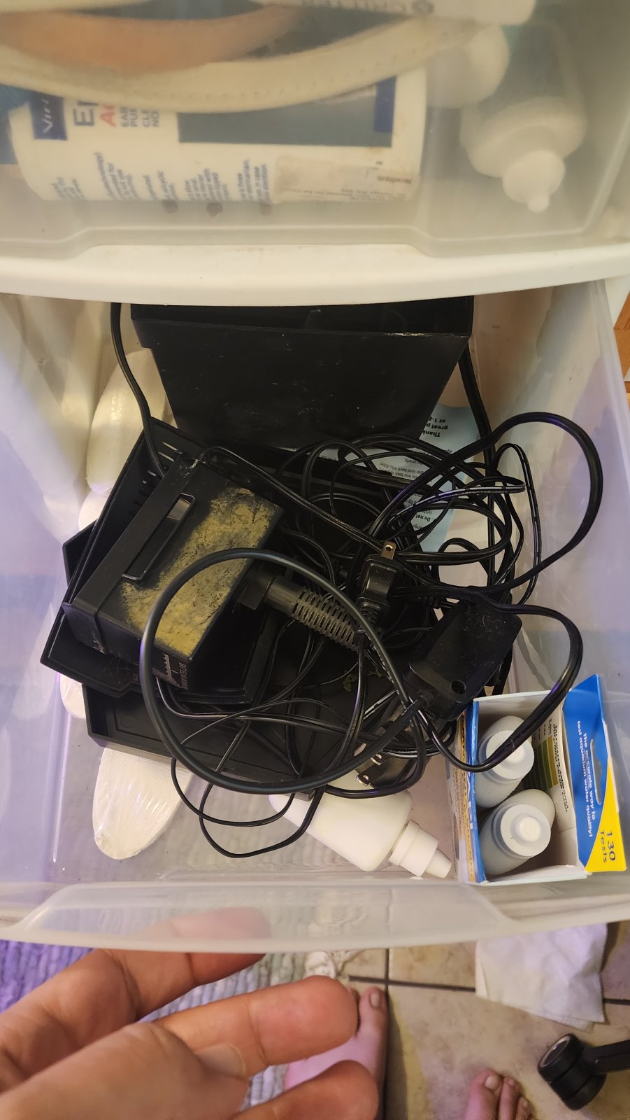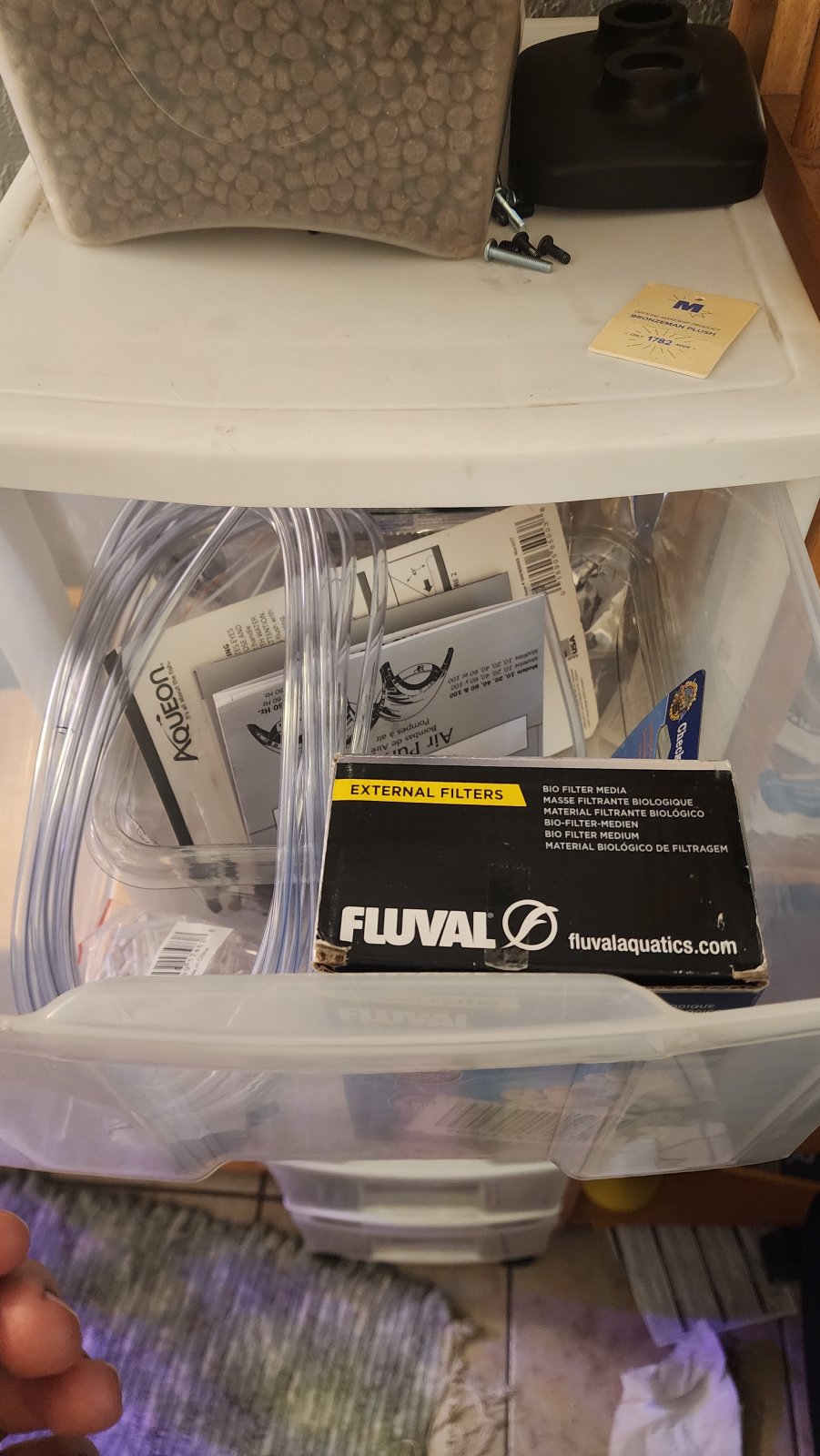 Any unused (used or new) supplies like HOB, filter media, wood, rocks, lights, air pumps/tubing/stones...etc. Goes into plastic bins on the other side of the basement. Even have some heavy duty Lifeguard pumps for the Matten filters we had set up on the 120 and 125 in the last house. The stuff has come in handy in emergencies.