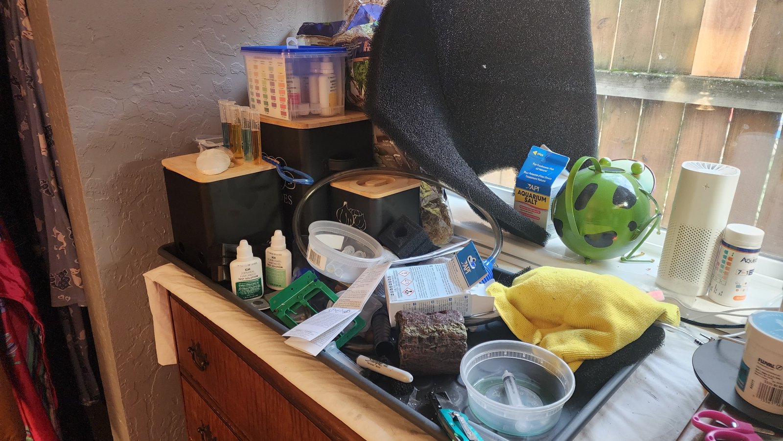 For my every day supplies I have a chrome NSF wire shelf. It's got the food, nets,tongs, scissors, meds, testing stuff and some misc stuff.