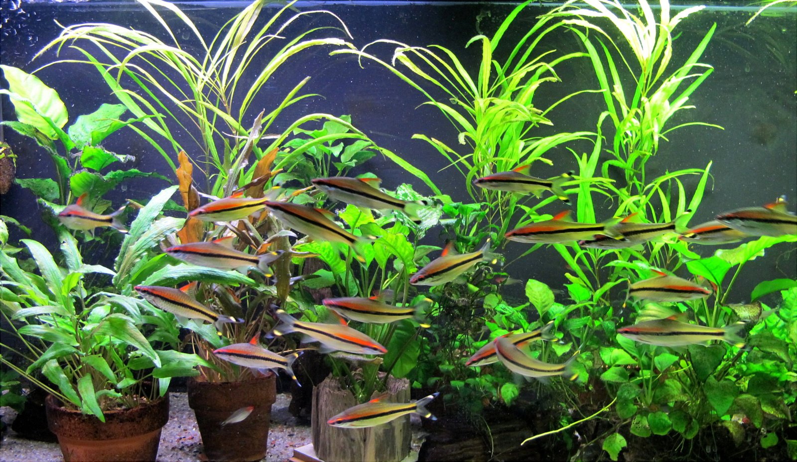 I have kept the red-lines for a number of years. I started with some in a 45 gal. Today they live in my 150 with clown loaches. The barbs appreciate some open swimming space and tend to move as a group, more or less. They also like to cruise in the plants.