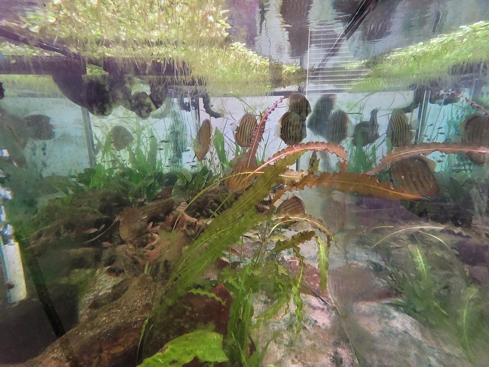 As for the discus - i've been feeding mine greens (algae max, bug bite for bottom feeders, ...) mixed with freeze dried black worms and a touch of bio-gold and tetra bite; it took them a couple of days to start eating after i received them and now a month later they never hide or have a problem with the lights or myself (these are wild caught discus - tank raised might be different); they definitely prefer the freeze dried black worms and go after them first but will graze on the other stuff. I try to limit the amount of worms to one cube per feeding (two feedings a day) shared by 10 near adult discus.