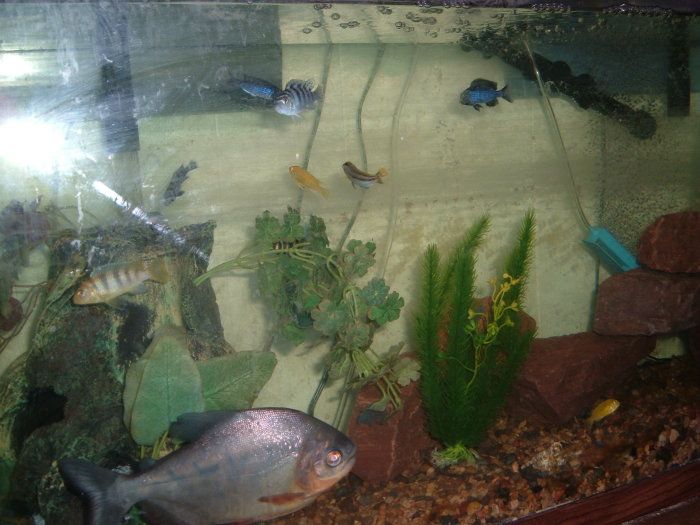 I wondered if anyone would notice...tried to keep him out of the shots, but he's sneaky, so I'll explain. I used to manage a pet store and we always got dumper pacus. Pretty soon there was no room in the store, so the store paid to build me and my husband a 500gal tank on the understanding that we would take overflow dumped fish. We had four pacus, three that grew up, and then little Mongo, who you have just seen who only got to be about 5 1/2 inches. He's always been real healthy and eaten well, he just never grew any bigger than that. We've had him five years and he hasn't grown an inch. Anyway, that big tank is sitting empty in my garage because it needs resealed, so Mongo has to live in with my mbunas for awhile ( He'd get beat up in my 150) To tell you the truth I am kind of reluctant to fix the big tank because I know we'll start getting pacu calls again (our wal-mart sells them) and I don't know if I want to do the water changes again.