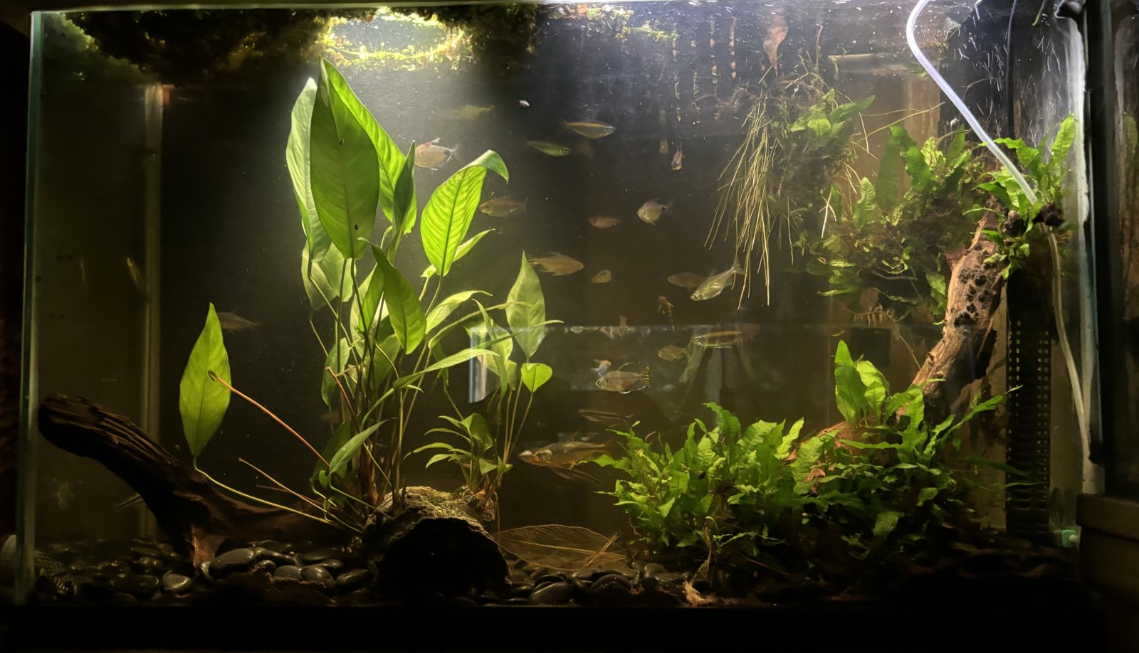 We had Sumer Tiwari at our club's last meeting talking about fish photography. He writes articles for Amazonas magazine and usually takes the pictures for his articles. He takes the fish out of their regular tank and puts them in a tank specifically for the pictures. He adds lights from the side and above in addition to the light on the camera. He uses a professional camera and takes tons of shots to get the right one for the article (he said about 500 usually). There are a lot of things that he looks for, and he showed us pictures that I thought were great but he pointed out issues with- so it is all relative to what you're trying to achieve, I guess.