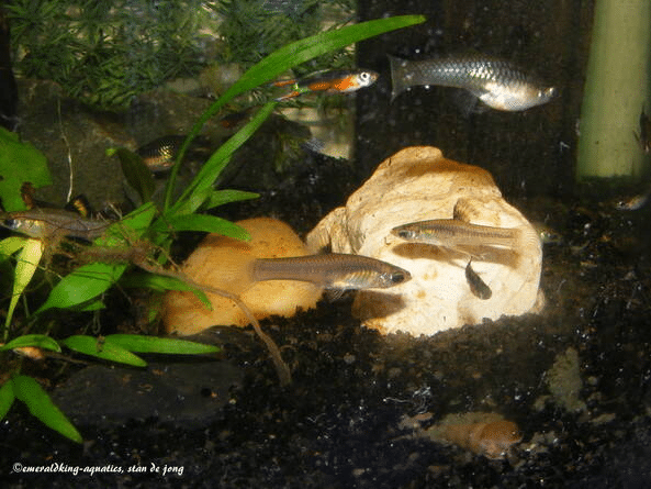 Superfetation is a state of multiple pregnancies at different stages. Superfetation occurs in both ovoviviparous and viviparous livebearers. A joined study of the University of Wageningen discovered that superfetation occurred in both types of livebearers. I've joined the lecture. The ones that are superfetative are less in number than the non-superfetative species. Superfetation occurs mostly in livebearers that are living in fast streaming water where livebearers swim with the current and against the current. If such a female gets pregnant, superfetation allows her to become fat by the pregnancy but not that fat to be pushed away in the water current (whether that concerns with or against the current). Because such a female won't have the full batch of a normal carrying female, she can allow herself to still have a streamlined body despite of her pregnancy. And it also makes it able to let her even stay still in flowing water if she needs to. Males of superfetative livebearers have mostly an elongated gonopodium to waste not time in a fast flowing water stream to direct their gonopodium to the females vent. And as I've already mentioned before, males with an elongated gonopodium won't need a courtship to get as close as possible to a female to try to mate. There are some exceptions and one of those exceptions are Micropoecilia species. These can be normal ovoviviparous or superfetative. Males won't have the elongated gonopodium but just a short with hooks gonopodium. But we should look at the shape of the female. if you take a fast look, such a female look somewhat similar to a guppy female. But the females of Micropoecilia species are a more slender, their nose is more pointed and their dorsal is more to the back in comparison to guppy females. This makes them more aerodynamic which they also need in fast flowing waters. If they live in fast flowing waters, they're mostly superfetative. Specimens living in more slow moving water till even still, are in general normal ovoviviparous.
